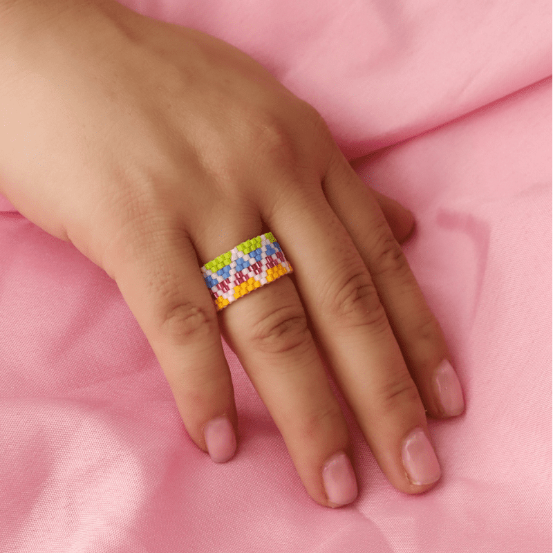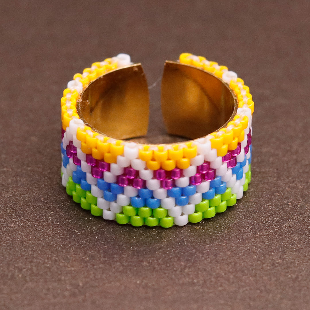 ___________________ MEXICO: $ 222,7 CHILE: $ 11050,4 DOLAR: 11,65 USD ___________________ ANILLO MIYUKI.Elaborado con miyuki e hilo en la técnica brick stitch o puntada ladrillo.Base ajustable en bronce con baño de oro.Medidas: 1 cm de alto.¡HECHO A MANO 100% COLOMBIANO!
