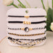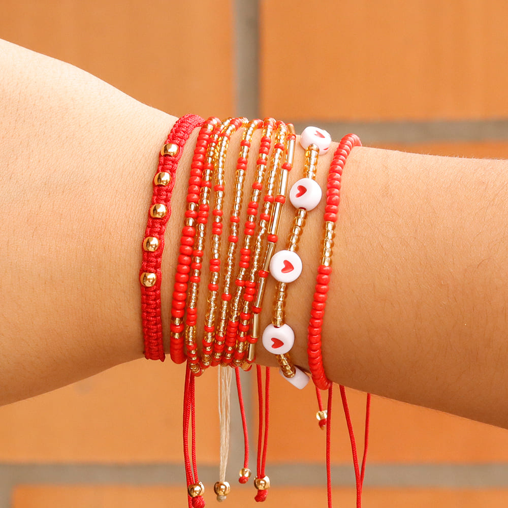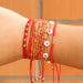 Set de manilla Elaborada con hilo celular con la técnica de tejido macramé acompañada con chaquira checa, mostacilla checa, perla de vidrio #6, Murano #4 y #6, canutillo, separadores, dijes y balin en bronce con baño de oro.